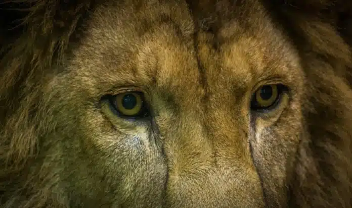 Αλλά αμέσως αφού άγγιξε τη χαίτη του ζώου, σε προφανές σημάδι της φρίκης που έρχεται, το λιοντάρι γλείφει τα χείλη του και ο άνδρας φαίνεται να υποχωρεί στιγμιαία προς τη μεταλλική πύλη.
