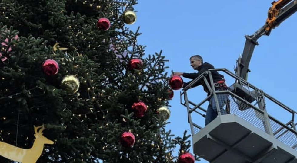 Κώστας Μπακογιάννης: Πάνω σε γερανό για να βάλει την τελευταία μπάλα στο χριστουγεννιάτικο δέντρο