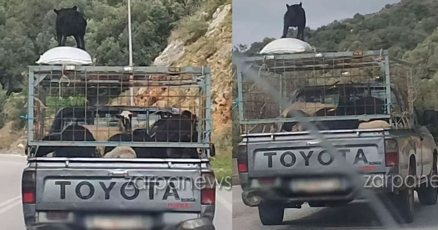 Ο σκύλος προσπαθεί να παραμείνει όρθιος για να μην σκοτωθεί. Το αγροτικό αυτοκίνητο επιταχύνει στην Κρήτη και οι εικόνες που τραβούν διερχόμενοι οδηγοί προκαλούν οργή…