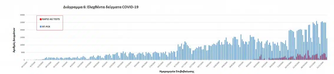 Δείγματα που έχουν ελεγχθεί: Από την 1η Ιανουαρίου 2020 μέχρι σήμερα, στα εργαστήρια που διενεργούν ελέγχους για τον νέο κορωνοϊό (SARS-CoV-2) και που δηλώνουν συστηματικά στον ΕΟΔΥ το σύνολο των δειγμάτων που ελέγχουν, έχουν συνολικά ελεγχθεί 2092324 κλινικά δείγματα ενώ από Μονάδες Υγείας και Κλιμάκια του ΕΟΔΥ που διενεργούν ελέγχους Rapid Ag έχουν ελεγχθεί 112416 δείγματα.