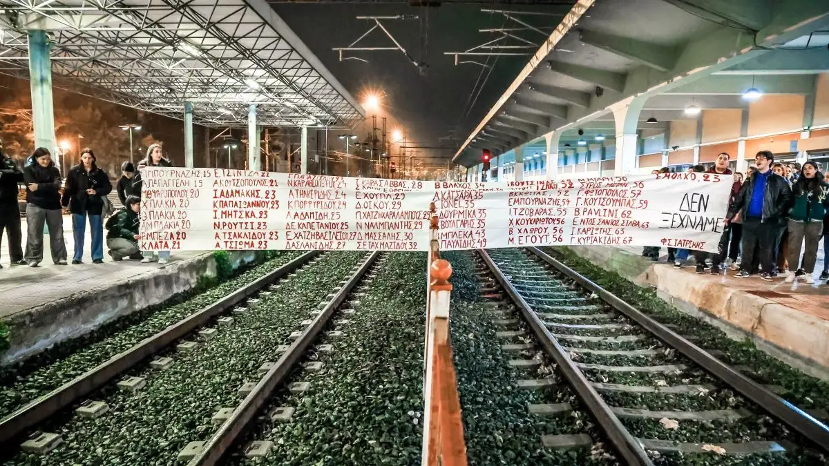Φοιτητές της ιατρικής σχολής Λάρισας συγκεντρώθηκαν στο σιδηροδρομικό σταθμό για να διαμαρτυρηθούν για το δυστύχημα στα Τέμπη