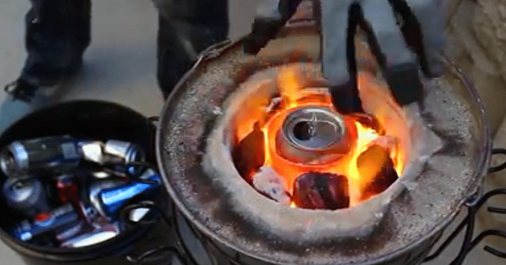 Γεμίστε το χυτήριο με κάρβουνα γύρω από το χωνευτήρι και ανάψτε τα κάρβουνα με ένα φλόγιστρο προπανίου, για καλύτερο αποτέλεσμα. Μόλις τα κάρβουνα είναι έτοιμα, βάλτε το πιστολάκια στη χαμηλότερη ρύθμιση και σκεπάστε το χυτήριο με ένα κάλυμμα το οποίο να έχει μια τρύπα στη μέση όση η διάμετρος του δοχείου. Μετά από 10 λεπτά, η φωτιά θα πρέπει να είναι αρκετά δυνατή. Το χωνευτήρι θα έχει γίνει πορτοκαλί και η θερμοκρασία του θα είναι πάνω από 540⁰C. Χρησιμοποιήστε μια λαβίδα από χάλυβα για να αφαιρέσετε το κάλυμμα και για να τοποθετήσετε τα κουτιά μέσα στο χωνευτήρι. Αν πιέσετε τα δοχεία πριν τα ρίξετε μέσα, λιγότερο μέταλλο θα οξειδωθεί. Θα χρειαστούν 38-45 κουτιά για να φτιάξετε 0.5 κιλό λιωμένο αλουμίνιο.