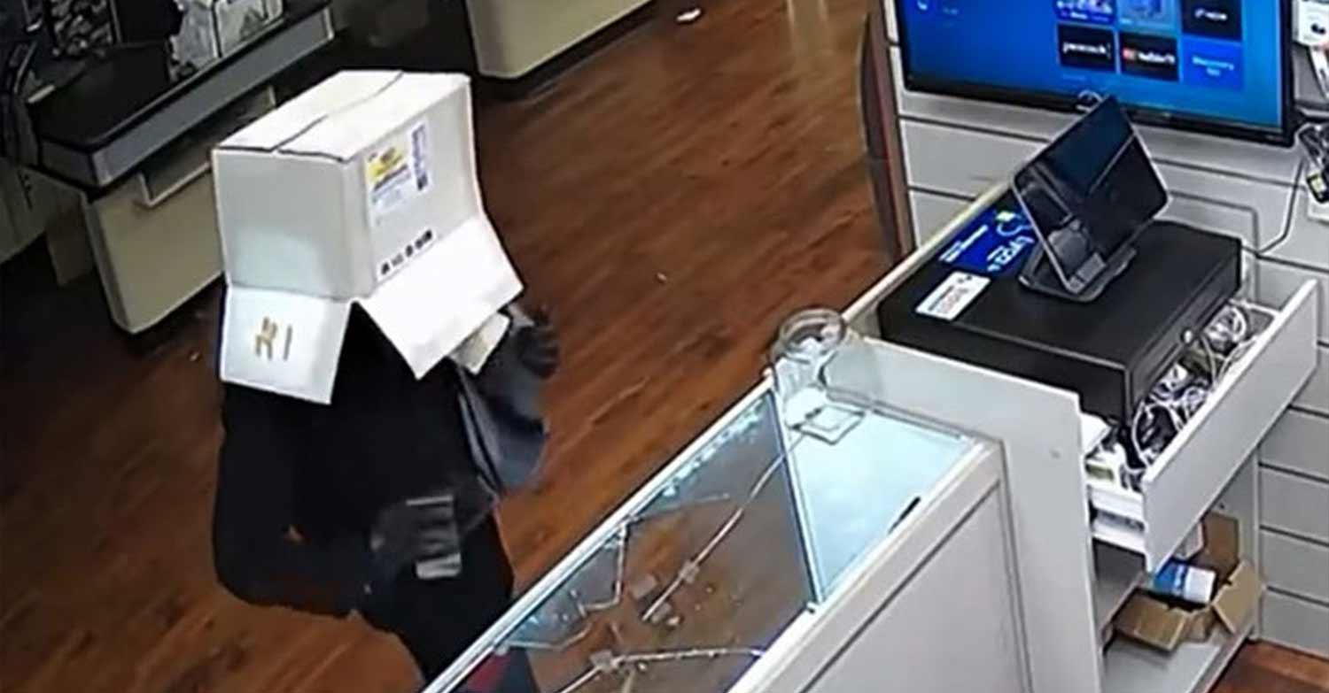 Ο ιδιοκτήτης του καταστήματος, που βρίσκεται στο “Miami Gardens”, μοιράστηκε με το “NBC 6” πλάνα από την παράξενη διάρρηξη που πραγματοποιήθηκε γύρω στις 4 το πρωί του Σαββάτου. Το βίντεο δείχνει τον άγνωστο άνδρα να σπάει τις γυάλινες προθήκες και να παίρνει τα τηλέφωνα ενώ φοράει το κουτί σε μια προφανή προσπάθεια να κρύψει το πρόσωπό του. Όμως ο ληστής αφαίρεσε για λίγο το κουτί καθώς έψαχνε τα εμπορεύματα του καταστήματος. Ο ιδιοκτήτης του μαγαζιού είπε στο “NBC 6” ότι ο άνδρας έκλεψε 19 iPhone και 8.000 δολάρια σε μετρητά.