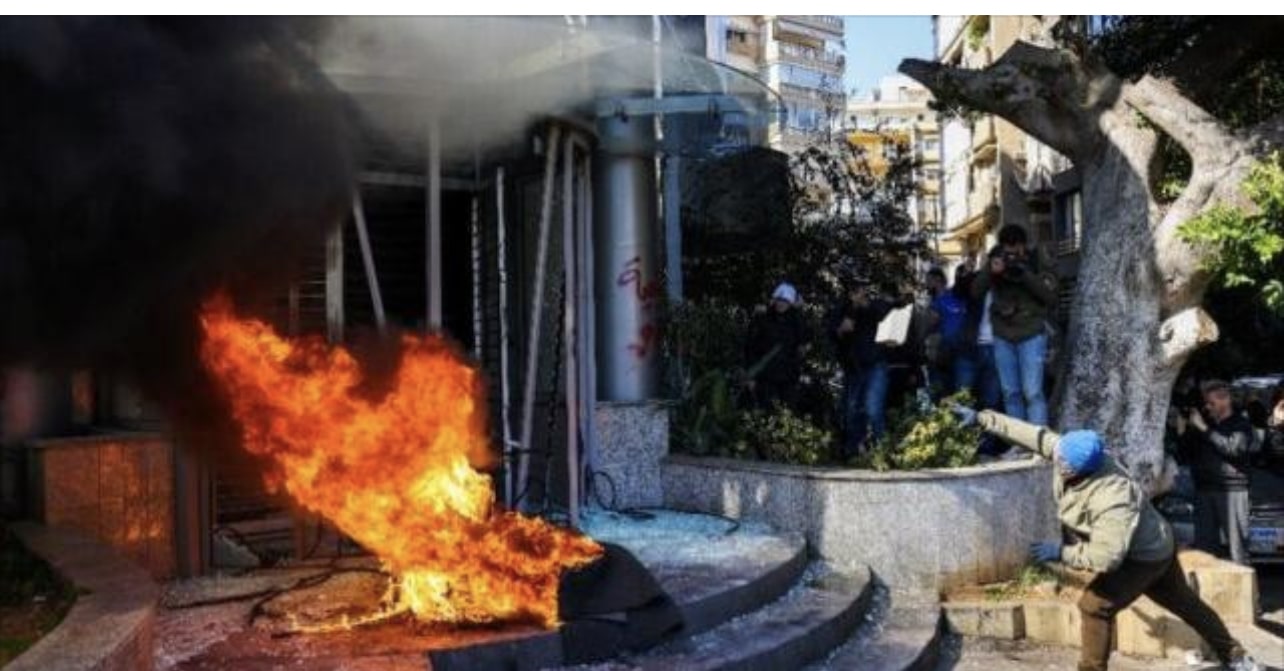 Protesters in Beirut, Lebanon, began setting fire to multiple banks on Feb 16 after a new exchange rate was established, devaluing the country’s currency by 90% and restricting people's access to their accounts pic.twitter.com/DEHrBemUSx