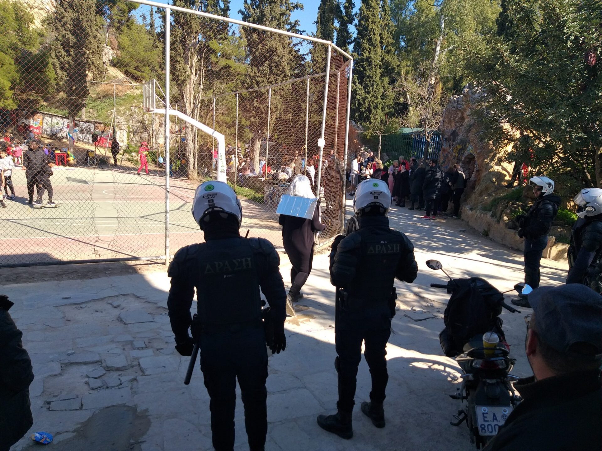 Ακόμα και σε παιδικό πάρτι στο Λόφο του Στρέφη έκαναν την εμφάνισή τους αστυνομικές δυνάμεις. Όπως καταγγέλλει η Ανοιχτή Συνέλευση Υπεράσπισης του Λόφου Στρέφη, η οποία δημοσίευσε σχετικά βίντεο και φωτογραφίες, την ώρα που πραγματοποιούνταν παιδικό πάρτι του δημοτικού σχολείου και τα παιδιά έπαιζαν μπάσκετ, είχαν παραταχθεί γύρω τους αστυνομικοί.
