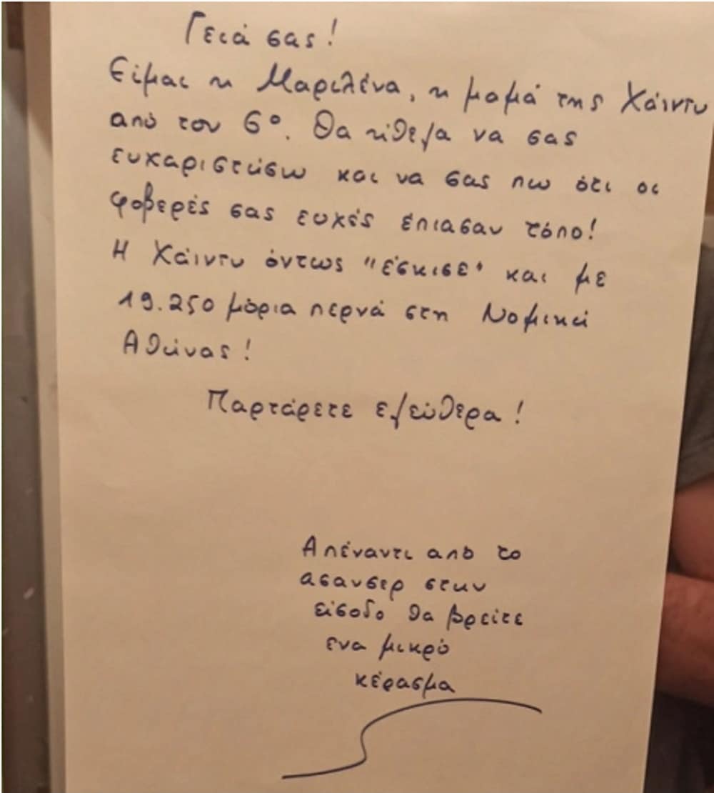 Τους άφησε ένα χαρτάκι στο ασανσέρ αλλά και σοκοφρετάκια για να τους πει το δικό της «ευχαριστώ».