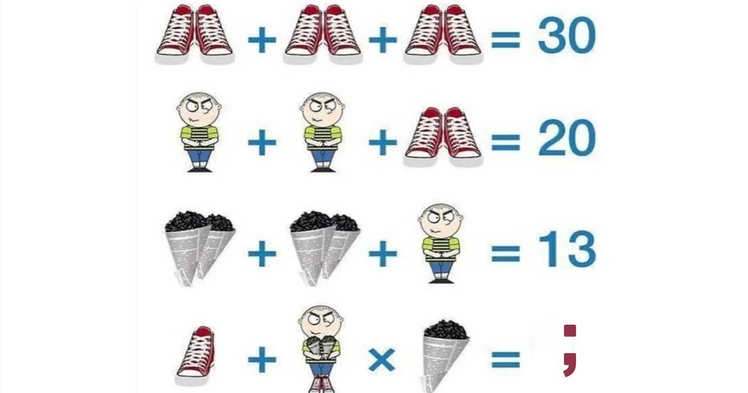 Αν παρατηρήσετε καλά την εικόνα, η τελευταία εξίσωση δεν είναι τόσο απλή, καθώς υπάρχουν ένα παπούτσι, ένα χωνάκι και το αγόρι φοράει 2 παπούτσια και κρατάει 2 χωνάκια. Όσοι βιάστηκαν να κάνουν τις πράξεις και δεν παρατήρησαν αυτήν την λεπτομέρεια δεν βρήκαν την σωστή απάντηση.