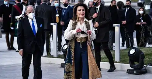Με παραδοσιακά αυθεντικά ενδύματα και κοσμήματα της Ηπείρου εμφανίστηκε η πρόεδρος της Επιτροπής 2021, Γιάννα Αγγελοπούλου στην ειδική επετειακή εκδήλωση των εγκαινίων του νέου κτιριακού συγκροτήματος της Εθνικής Πινακοθήκης