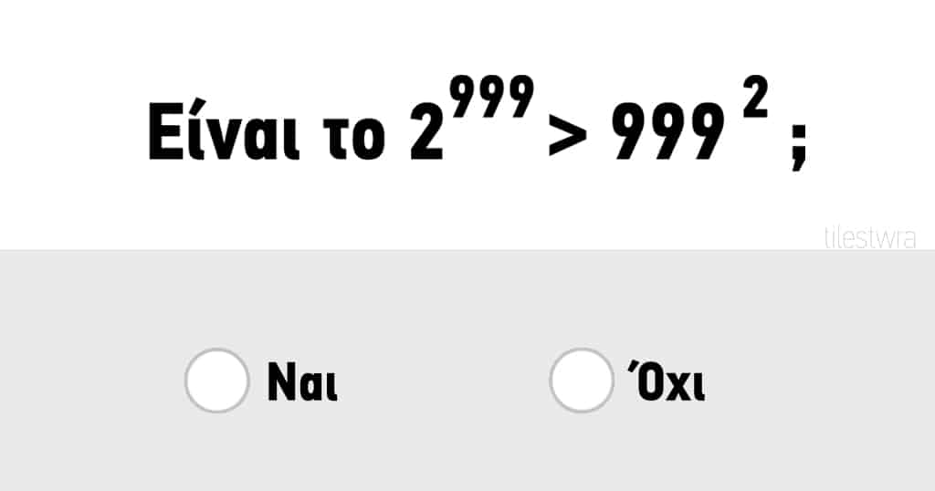 Μια εξήγηση είναι ότι όντως ισχύει η ανίσωση, αφού αν υπολογίσουμε το 999^2 βγαίνει σίγουρα ένας αριθμός με 6 ψηφία. Το 2^20 βγαίνει αριθμός με 7 ψηφία, άρα οτιδήποτε πάνω από αυτό θα βγάζει πολύ μεγάλο αποτέλεσμα. Επομένως,