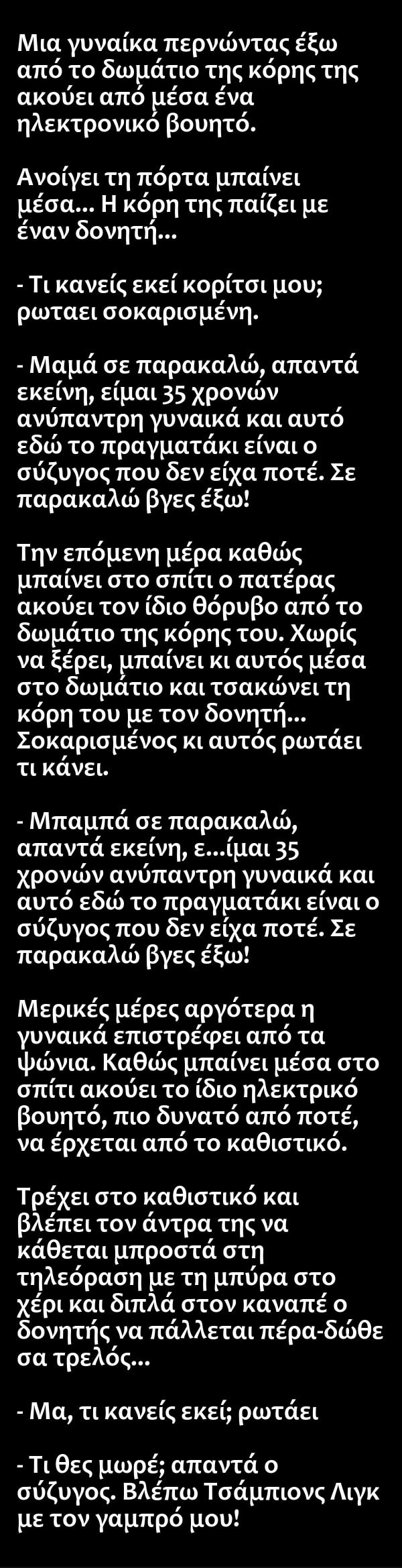a825dde4d895d4f2df661044b5ad9d7dΜια γυναίκα περνώντας έξω από το δωμάτιο της κόρης της ακούει από... Μια γυναίκα περνώντας έξω από το δωμάτιο της κόρης της ακούει από μέσα ένα ηλεκτρονικό βουητό… 21 Ιανουαρίου 2016 01:08 a825dde4d895d4f2df661044b5ad9d7dαστεία 124 Τα πιο σημαντικά Οι γιατροί αποκαλύπτουν ότι η κατανάλωση αυγών το πρωί προκαλεί… 14 Δεκεμβρίου 2025 03:44 Ένας παντρεμένος άντρας πάντα ψάχνει για ερωμένη, επειδή η γυναίκα του δεν… 14 Δεκεμβρίου 2025 00:11 Πάγωσε το χαμόγελο της Στεφανίδου: Η «φαpμακερή» ατάκα του Γιάννη Μπέζου στον αέρα, έκανε «σκóνη» τη δημοσιογράφο 14 Δεκεμβρίου 2025 01:37 Γαρυφαλλιά Καληφώνη: «Το θεωρώ προβληματικό ένας 35άρης άντρας να είναι σε σχέση με μία 20χρονη» 14 Δεκεμβρίου 2025 00:01 Η Κίμπερλι Γκιλφόιλ στο ΣΕΦ με τους αδελφούς Αγγελόπουλους – Χαμός με τα πόδια της 14 Δεκεμβρίου 2025 12:32