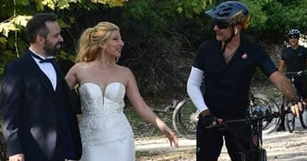 Ο πρωθυπουργός δεν χάλασε το χατίρι στη νύφη, κόρη γνωστού στελέχους της ΝΔ από τη Νίκαια και πόζαρε μαζί με τους νεόνυμφους πάνω στο ποδήλατο.