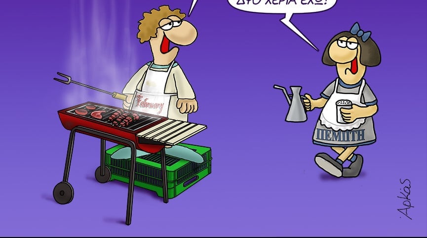 Στο σκίτσο, ένας άνδρας στέκεται μπροστά σε αναμμένη ψησταριά, με τα κρέατα να «καπνίζουν» και την ατμόσφαιρα να είναι ήδη βαριά από τσίκνα. «ΛΑΔΙ ΚΑΙ ΡΙΓΑΝΗ ΕΙΠΑΜΕ!», φωνάζει με ενθουσιασμό, αποτυπώνοντας την ιεροτελεστία του σωστού ψησίματος. Απέναντί του, μια γυναίκα με ποδιά που γράφει «ΠΕΜΠΤΗ» κρατά κανάτα και τρίφτη, απαντώντας με νόημα: «ΕΡΧΟΝΤΑΙ… ΔΥΟ ΧΕΡΙΑ ΕΧΩ!».