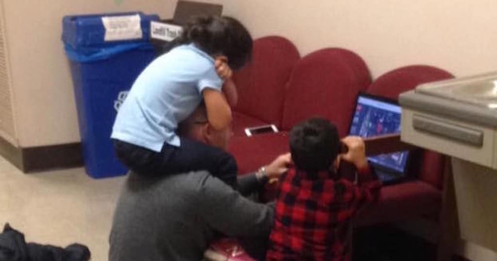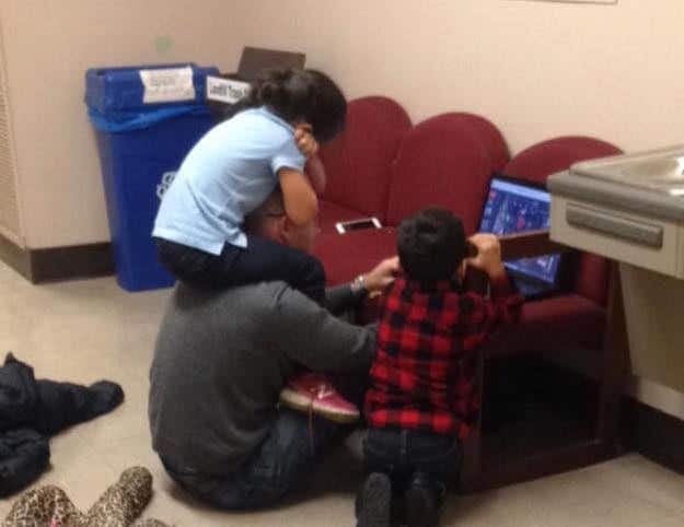 Μετά αυτός έπαιξε με τα παιδιά, έτσι η μητέρα τους μπόρεσε να γράψει. Την φωτογραφία την τράβηξε η φίλη της η Henry,που την δημοσίευσε στο Facebook.