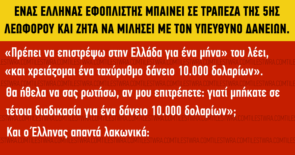 Το περιστατικό έγινε στο Μανχάταν της Νέας Υόρκης: ένας Έλληνας εφοπλιστής μπαίνει σε τράπεζα της 5ης λεωφόρου και ζητά να μιλήσει με τον υπεύθυνο δανείων.