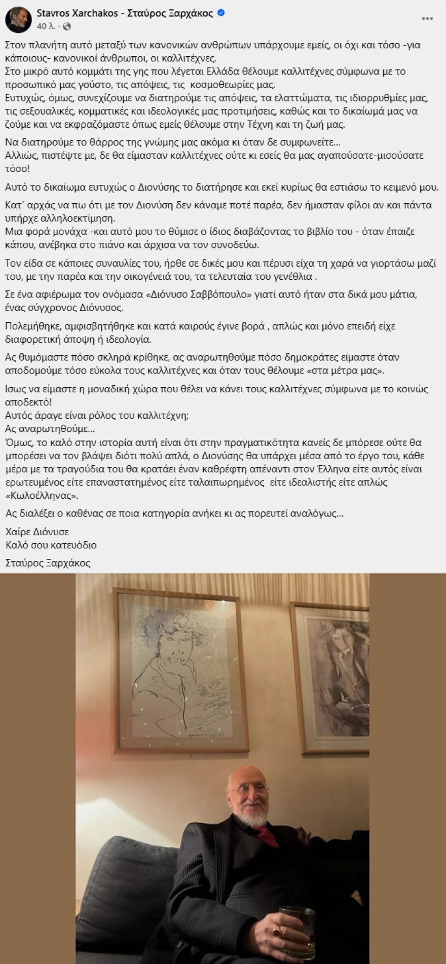 «Χαίρε Διόνυσε, καλό σου κατευόδιο»: με τον δικό του, ξεχωριστό τρόπο αποχαιρετά ο μεγάλος Έλληνας μουσουργός, Σταύρος Ξαρχάκος, έναν άλλο σπουδαίο του ελληνικού πενταγράμμου, τον Διονύση Σαββόπουλο, που «έφυγε» χθες από τη ζωή, στα 81 του χρόνια.