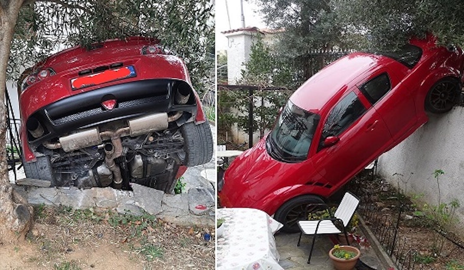 Επεισοδιακή «προσγείωση» σε αυλή σπιτιού στο Πανόραμα Θεσσαλονίκης έκανε ένα Ι.Χ. επιβατικό όχημα τα ξημερώματα της Κυριακής (26/2).
