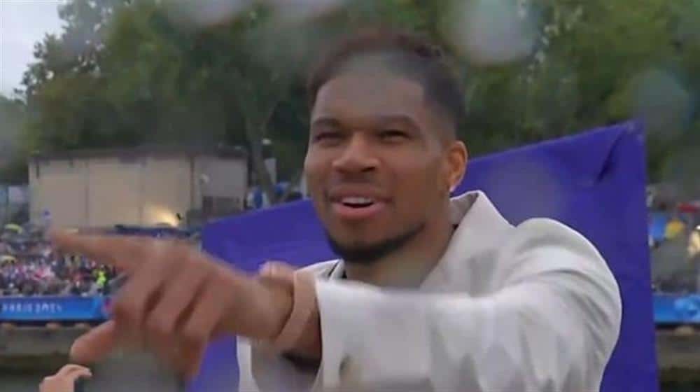 «Η μητέρα μου, η μητέρα μου ναι» λέει ο Γιάννης Αντετοκούνμπο στους υπόλοιπους αθλητές που βρίσκονται δίπλα του και δείχνει τη Βερόνικα Αντετοκούνμπο.