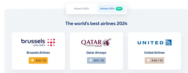 Για την ιστορία, καλύτερες αεροπορικές εταιρίες ψηφίστηκαν η Brussels Airlines με 8,12 βαθμούς, η Qatar Airways με 8,11 βαθμούς και η United Airlines με 8,04 βαθμούς.
