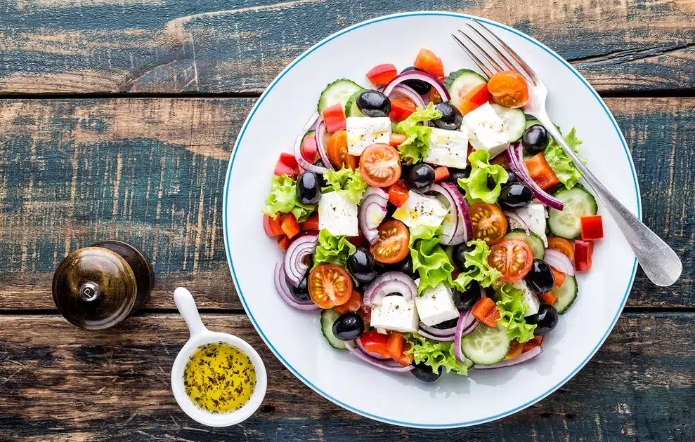 «Η ελληνική σαλάτα, γνωστή και ως χωριάτικη, είναι το εθνικό πιάτο της Ελλάδας, που αποτελείται από ντομάτες, κρεμμύδια σε φέτες και χοντρές φέτες αγγουριού. Ανάλογα με την περιοχή, μπορεί να υπάρχουν επίσης ελιές, πράσινες πιπεριές, τυρί φέτα, ρίγανη, αλάτι, πιπέρι ή ένα ντρέσινγκ από ελαιόλαδο και λεμόνι ή ξύδι (προαιρετικά).