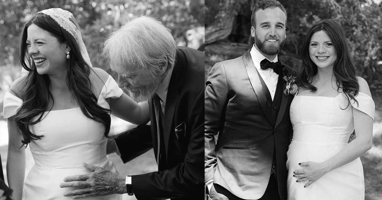 Η λαμπερή Μόργκαν φορούσε ένα λευκό off-the-shoulder νυφικό με δαντελένιο πέπλο καθώς πόζαρε με τον σύζυγό της, ενώ ο 94χρονος πατέρας της κρατούσε την κοιλιά της με αγάπη.