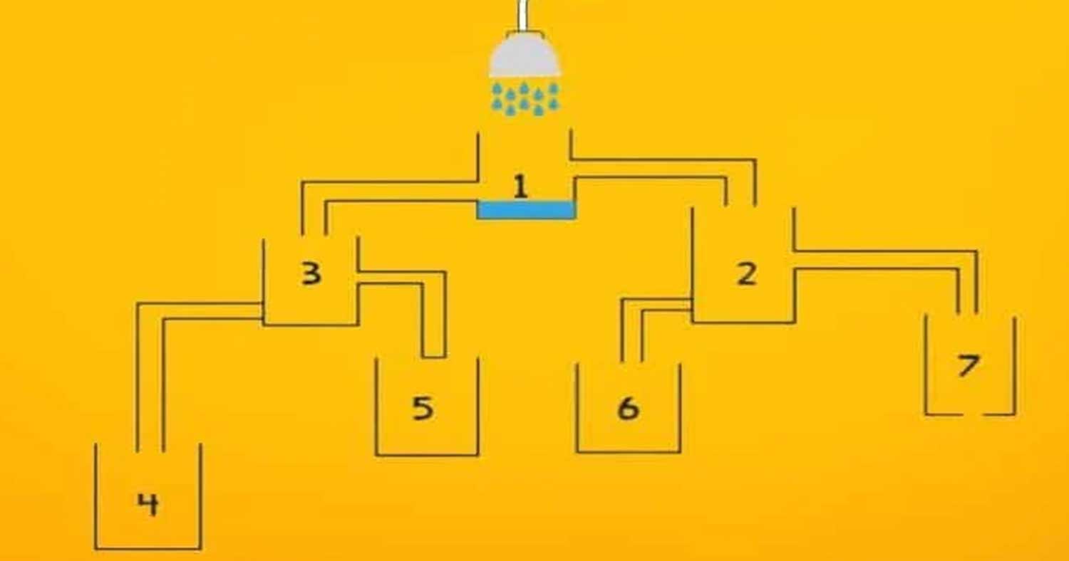 Η εικόνα δείχνει έναν περίπλοκο λαβύρινθο από σωλήνες και δεξαμενές νερού και ζητείται από τους λύτες, μέσα σε 25 δευτερόλεπτα, να υπολογίσουν ποια δεξαμενή θα γεμίσει πρώτη.