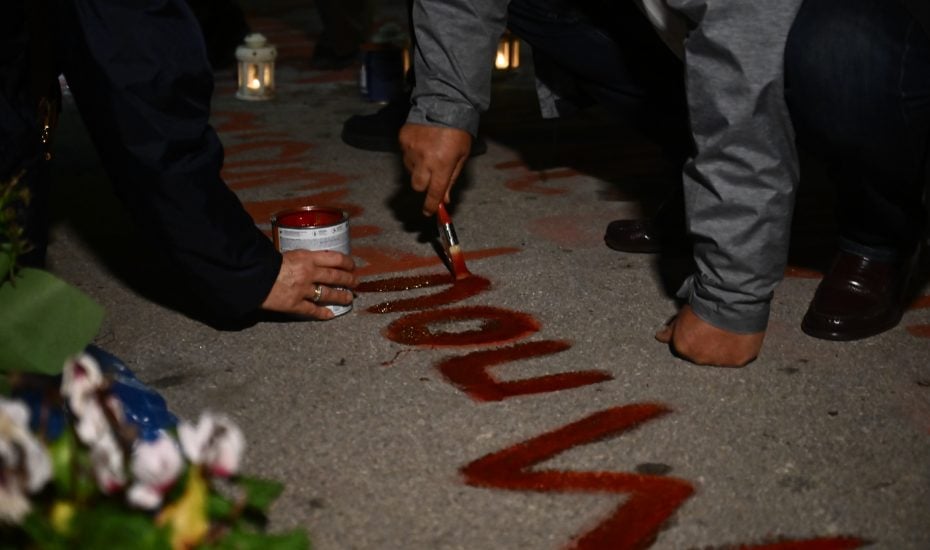 Η συγκέντρωση κορυφώθηκε με συγγενείς των θυμάτων, μεταξύ των οποίων και ο Πάνος Ρούτσι, να γράφουν ξανά τα ονόματα, με κόκκινη μπογιά, μπροστά από τη Βουλή.