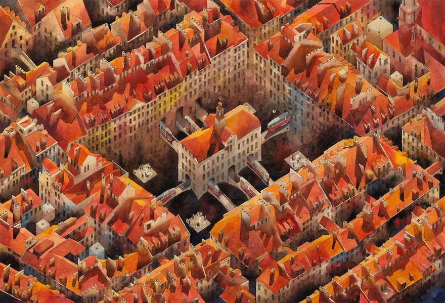 Στους πίνακες του Tytus Brzozowski, καλλιτέχνη και αρχιτέκτονα από την Βαρσοβία, όλα είναι πιθανά. Τα χαρακτηριστικά κόκκινα τραμ της Βαρσοβίας μπορούν να πάρουν πολύ απροσδόκητες κατευθύνσεις.