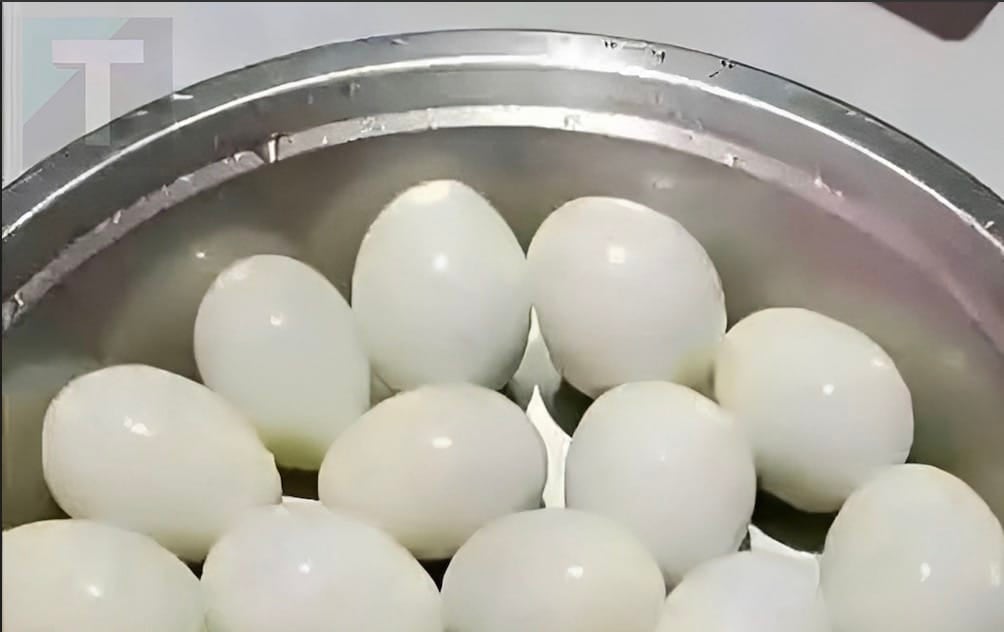 Στη φωτογραφία βλέπουμε μια μεταλλική λεκάνη γεμάτη με βρασμένα, καθαρισμένα αυγά.