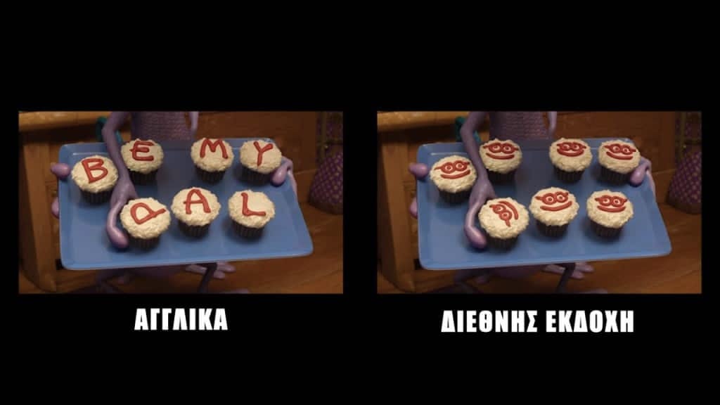 Eπίσης στο «Monsters University», τα γράμματα του «Be My Pal» που αναγράφονταν στα cupcakes έγιναν smileys, άρα κατανοητά από το κοινό κάθε χώρας.