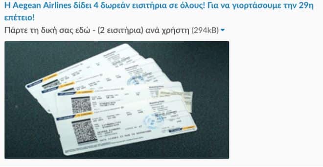 Εχουν εμφανιστεί δύο διαγωνισμοί (τουλάχιστον αυτούς εντοπίσαμε εμείς) που δίνουν ΣΕ ΟΛΟΥΣ τους συμμετέχοντες, δωρεάν από δύο εισιτήρια. Ο ένας δήθεν διαγωνισμός είναι της Easyjet και ο άλλος της Aegean