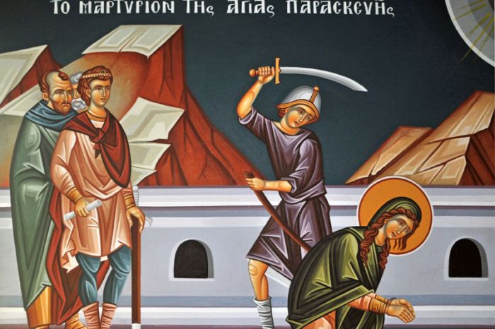 Aλλά στη χορεία των Αγίων της Εκκλησίας είναι πολλοί όχι μόνο όσιοι ασκητές, αλλά και καλλίνικοι μάρτυρες. Αυτοί είναι και λέγονται οσιομάρτυρες. Και τέτοια είναι η αγία οσιομάρτυς Παρασκευή, της όποιας σήμερα η Εκκλησία εορτάζει και τιμά την ιερή μνήμη. Η αγία Παρασκευή ήταν από τα περίχωρα της Ρώμης, στα χρόνια του αυτοκράτορα Αντωνίνου, δηλαδή στα 138 έως 161. Ο πατέρας της λεγότανε Αγάθων και η μητέρα της Πολιτεία, ήσαν δε και οι δύο ευσεβείς χριστιανοί. Αλλά δεν είχαν παιδιά, γι’ αυτό και προσεύχονταν και παρακαλούσαν το Θεό να τους δώσει ένα παιδί. Ο Θεός άκουσε την προσευχή των ευσεβών γονέων και γέννησαν ένα κορίτσι. Ήμερα Παρασκευή γεννήθηκε το παιδί και Παρασκευή το είπαν.
