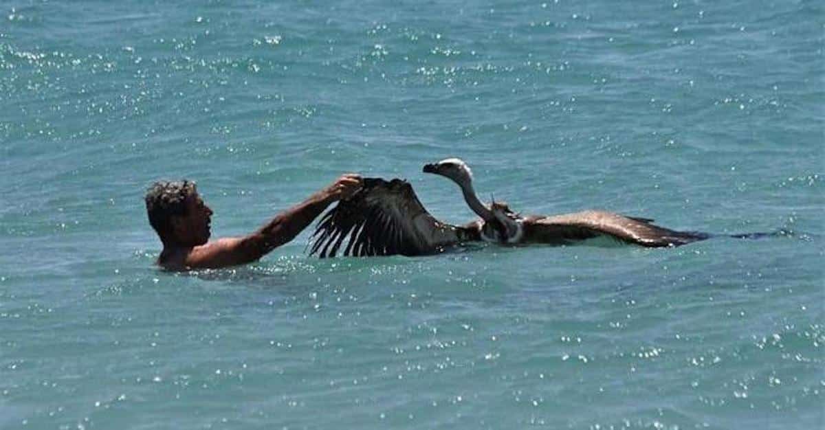 Εκεί που οι διασώστες έχασαν κάθε ελπίδα για τη σωτηρία του γύπα, εμφανίστηκε ένας άνδρας ο οποίος την ίδια στιγμή έκανε το μπάνιο του στην παραλία και, βλέποντας το πουλί να πνίγεται, χωρίς δεύτερη σκέψη βούτηξε και κατάφερε να το βγάλει έξω σώο.