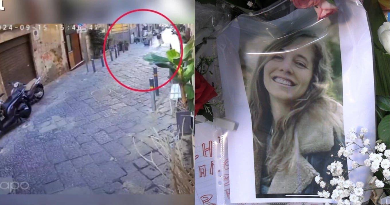 Footage from the freak accident shows 30-year-old Prada manager Chiara Jaconis walking through Naples with her boyfriend, when suddenly a statue falls from above and comes crashing down on her head. pic.twitter.com/ob1SX2in79