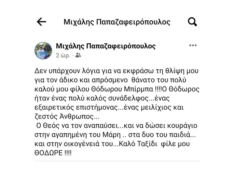 Η είδηση έγινε γνωστή από τον φίλο του και συνάδελφό του, Μιχάλη Παπαζαφειρόπουλο με ανάρτησή του στο φέισμπουκ: