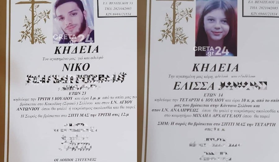 Η κηδεία του Νίκου θα πραγματοποιηθεί την Τρίτη 5 Ιουλίου στο Κακοδίκι Σελίνου ενώ η 14χρονη Ελίσσα θα κηδευτεί την Τετάρτη 6 Ιουλίου στην Κάνδανο.
