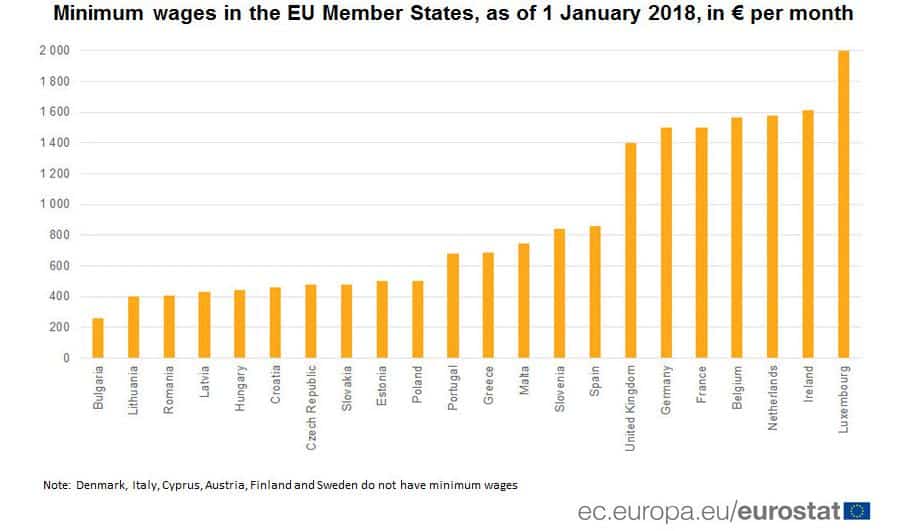 Τον Ιανουάριο του 2018, όπως καταγράφεται από την Eurostat, αποτυπώνονται μισθοί τριών ταχυτήτων με τη Βουλγαρία να έχει τις χαμηλότερες μηνίαιες μεικτές αποδοχές (261 ευρώ) και το Λουξεμβούργο τις υψηλότερες (1.999 ευρώ.) Η Ελλάδα βρίσκεται κάπου στη μέση με τον κατώτατο μισθό να διαμορφώνεται στα 684 ευρώ.