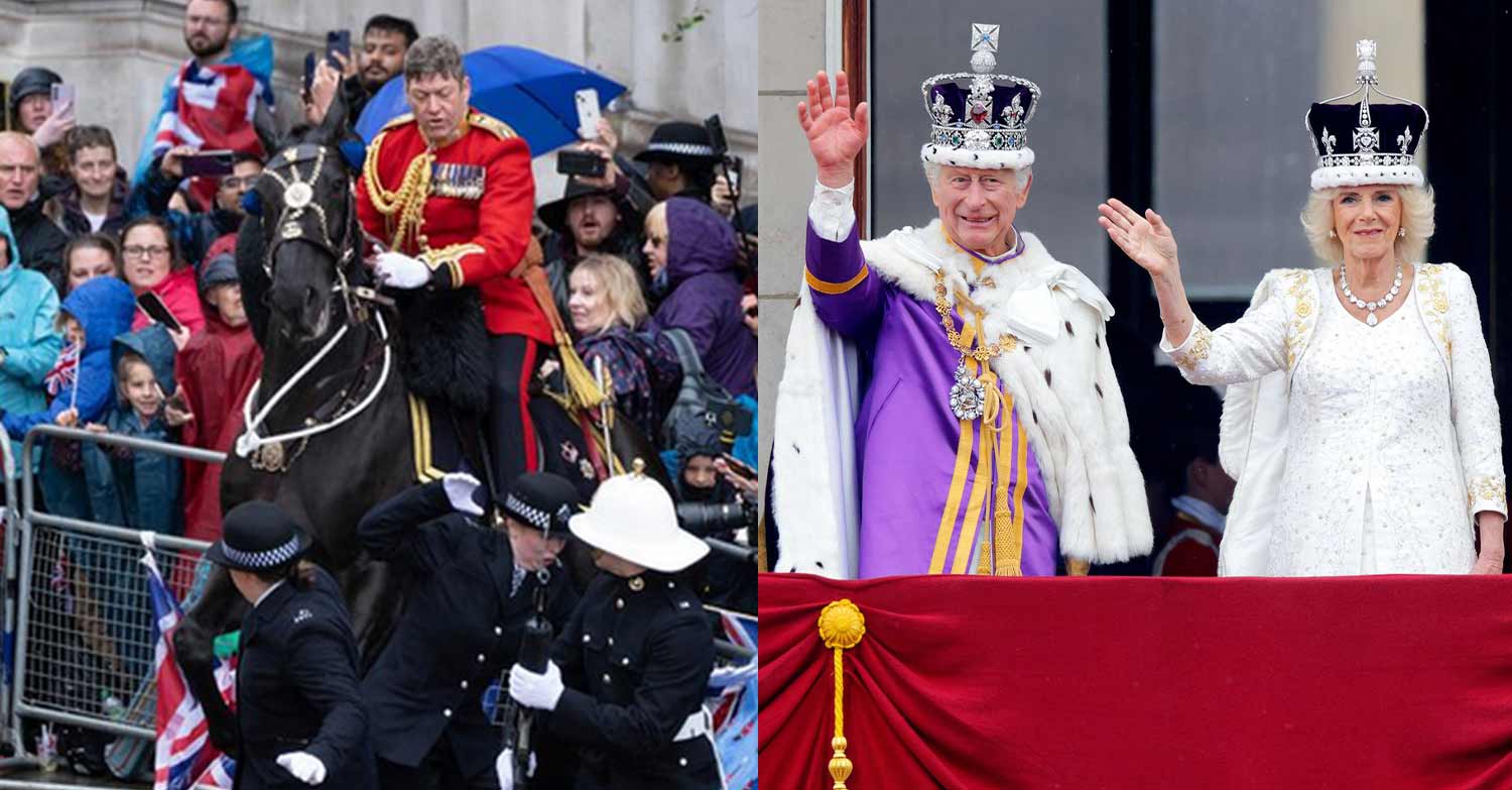 Μαύρο άλογο που συμμετείχε στην πομπή της στέψης του βασιλιά Καρόλου Γ’ ξέφυγε της πορείας του και έπεσε πάνω στα κάγκελα που «χώριζαν» το πλήθος από την παρέλαση. Ως αποτέλεσμα, τραυματίστηκε ένας αστυνομικός.