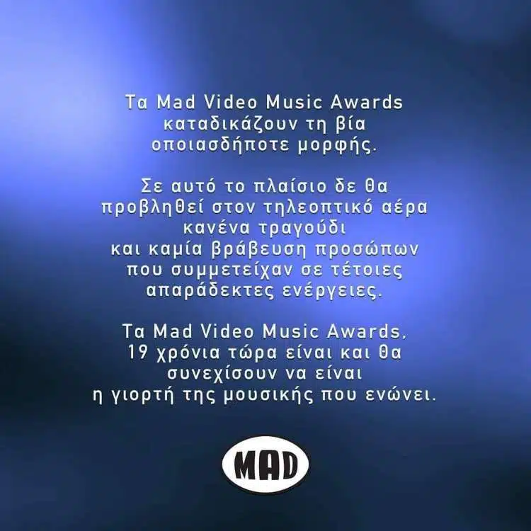 Οκακός χαμός που ξεκίνησε με το ξύλο μέσα στα Mad Video Music Awards συνεχίστηκε μέσα στη νύχτα αυτή τη φορά μέσα από τα social media. Λίγο μετά τις 3 τα ξημερώματα της Πέμπτης το MAD εξέδωσε μια ανακοίνωση σύμφωνα με την οποία αφού καταδικάζει τη βια οποιασδήποτε μορφής ενημερώνει πως «δε θα προβληθεί στον τηλεοπτικό αέρα κανένα τραγούδι και καμία βράβευση προσώπων που συμμετείχαν σε τέτοιες απαράδεκτες ενέργειες» εννοώντας φυσικά τους τράπερς Snik, Light και Tranno!