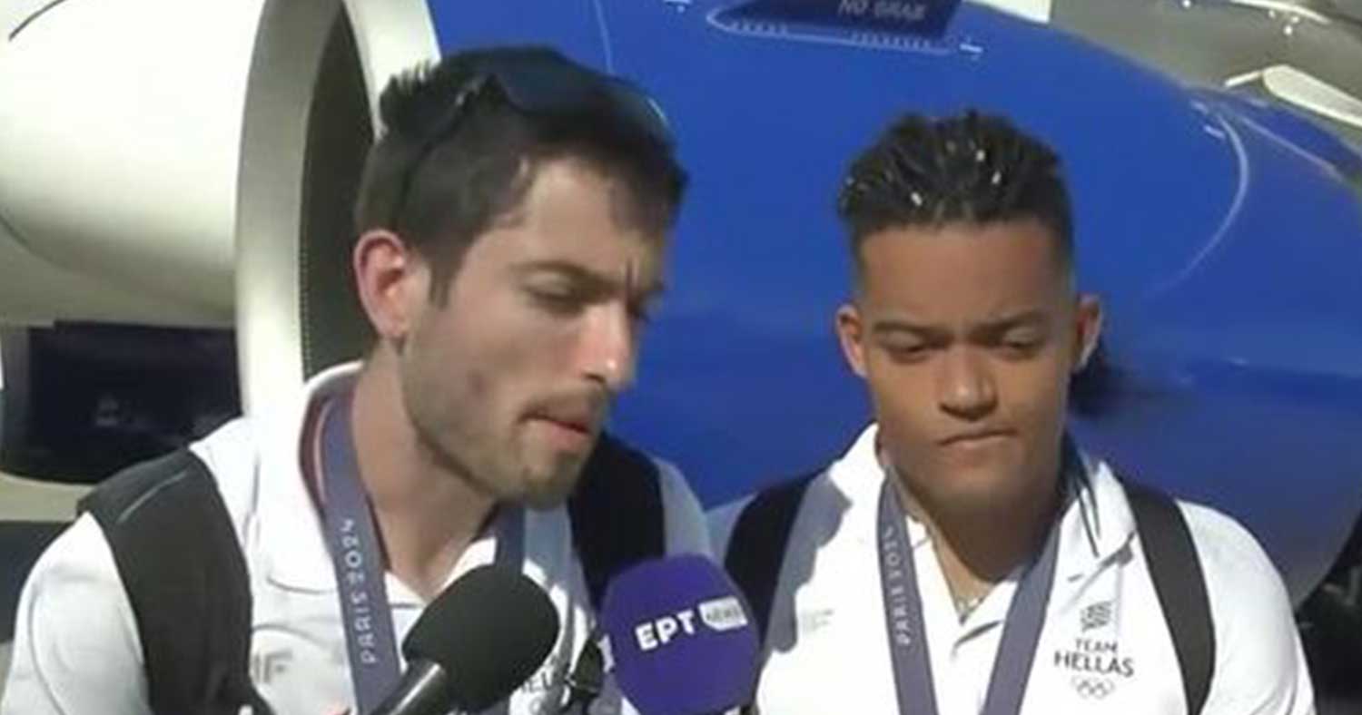 Μόλις κατέβηκαν τα σκαλιά του αεροπλάνου οι δύο μεταλλιούχοι και συγκάτοικοι στο Ολυμπιακό χωριό μίλησαν στις κάμερες της τηλεόρασης για τις επιτυχίες τους αλλά στάθηκαν και στις πυρκαγιές στην Αττική.