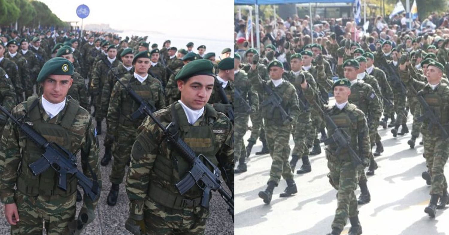 Λίγο πριν ολοκληρώσουν την παρέλασή τους στη Θεσσαλονίκη, ο ουλαμός της 1η Ταξιαρχίας Καταδρομών Αλεξιπτωτιστών τραγούδησε το «Μακεδονία Ξακουστή».
