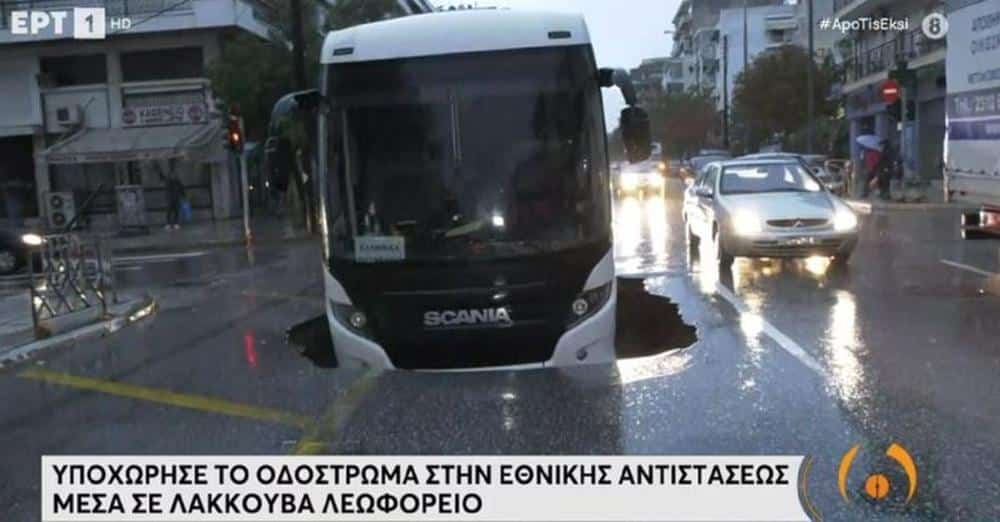 Λεωφορείο της εταιρείας Ελληνικά Πετρέλαια, που εκινείτο στην Εθνική Αντιστάσεως στη Θεσσαλονίλη και σταμάτησε για να παραλάβει δύο εργαζόμενους και όταν πήγε να ξεκινήσει, άνοιξε το οδόστρωμα και δημιουργήθηκε μεγάλη λακούβα και το όχημα βυθίστηκε.