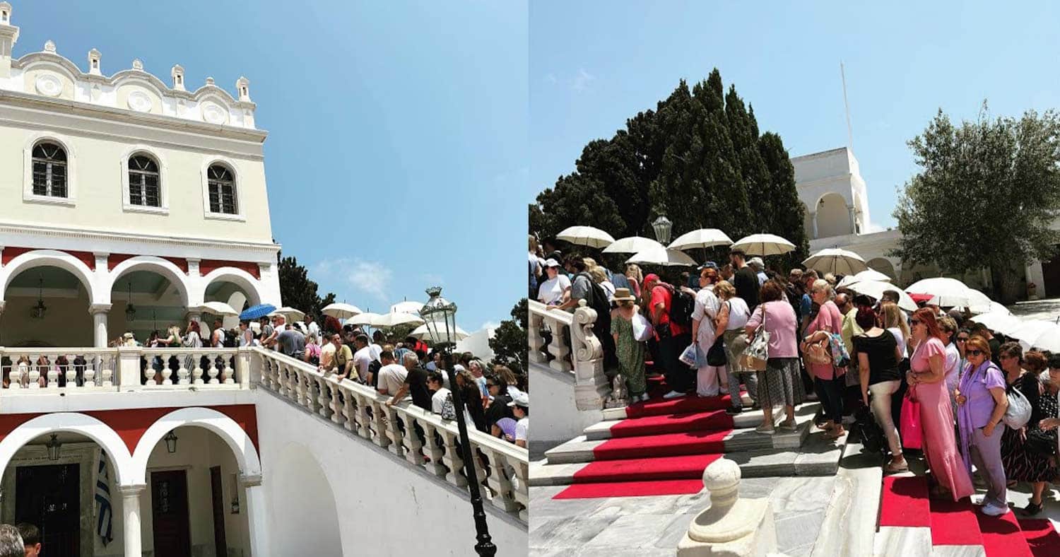 Οι προσκυνητές έχουν ήδη φτάσει στο νησί και περιμένουν στον περίβολο της εκκλησίας ενώ πολλοί είναι εκείνοι που εκπληρώνουν το τάμα τους και έρχονται με τα γόνατα από το λιμάνι.
