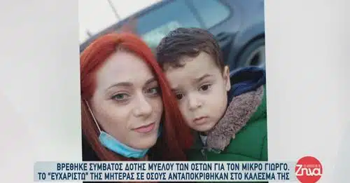 Η Ελένη, η μητέρα του μικρού Γιώργου έκανε ένα μεγάλο αγώνα μαζί με τους γιατρούς, ώστε να βρεθεί συμβατός δότης, ο οποίος θα χαρίσει στον γιο της μια δεύτερη ευκαιρία στη ζωή. Η μητέρα του αγοριού μίλησε στην εκπομπή «Αλήθειες με τη Ζηνα»: «Θέλω να πω ένα μεγάλο ευχαριστώ για την αγάπη και την στήριξη. Δεν περιμέναμε πραγματικά τέτοια ανταπόκριση από τον κόσμο» δήλωσε συγκινημένη.