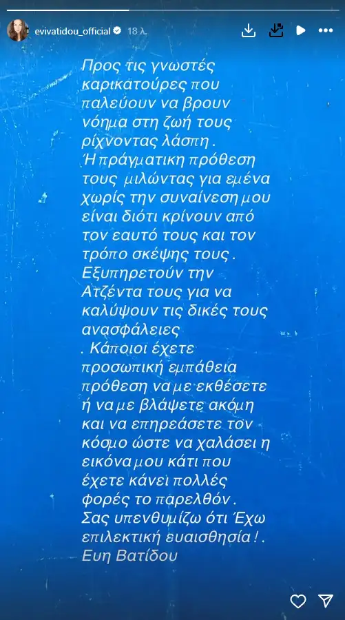 «Προς τις γνωστές καρικατούρες που παλεύουν να βρουν νόημα στη ζωή τους ρίχνοντας λάσπη. Η πραγματική πρόθεσή τους, μιλώντας για εμένα χωρίς την συναίνεσή μου, είναι διότι κρίνουν από τον εαυτό τους ή τον τρόπο σκέψης τους. Εξυπηρετούν την ατζέντα τους για να καλύψουν τις δικές τους ανασφάλειες. Κάποιοι έχετε προσωπική εμπάθεια, πρόθεση να με εκθέσετε ή να με βλάψετε ακόμη και να επηρεάσετε τον κόσμο ώστε να χαλάσει η εικόνα μου κάτι που έχετε κάνει πολλές φορές στο παρελθόν. Σας υπενθυμίζω ότι έχω επιλεκτική ευαισθησία!».